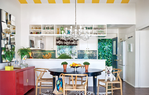 3- شوخ طبعی و بی احترامی. این نوع آشپزخانه ادامه دارد. این یک فضای خوش شانس است که ناحیه غذاخوری بخشی از آشپزخانه است؛ بنابراین، لایه بندی بیشتر با استفاده از مبلمان میسر است. (با آشپرخانه ای که از باقی خانه با یک تیغه جدا شده است، انجام این سطح از اختلاط کار سخت تری شده است). این نوع فضا است که تحلیل آن لذت بخش است. شما کاشی و کابینت های مدرن را در ترکیب با لوستر سنتی و میز غذاخوری به کار می برید. کنتراست بیشتری توسط صندلی های مدرن و کنسول های قرمز لاک دار ایجاد می شود. شوخ طبعی با نوارهای زرد روی سقف به محیط اضافه می شود. نه فقط دوره ها و سبک های مخلوط در اتاق غالب هستند بلکه با تعداد اندکی از رنگ های موجود نیز این عمل انجام شده است.